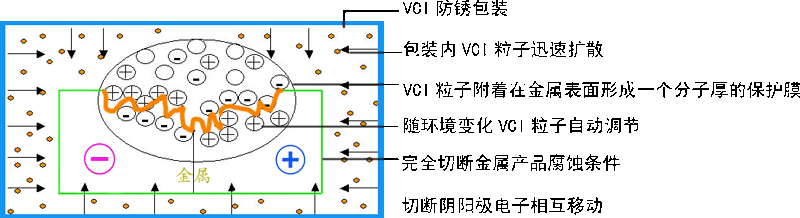 VCI是英文(Volatile Corrosion Inhibitor)的縮寫,它是一種具有揮發(fā)性的腐蝕抑制劑,簡(jiǎn)稱為氣化性防銹產(chǎn)品。當(dāng)用氣化性防銹產(chǎn)品包裝好被包裝物以后,防銹產(chǎn)品的防銹粒子氣化成氣體,吸附在金屬表面形成保護(hù)膜,切斷金屬離子與水、氧氣接觸的可能性,有效抑制了金屬腐蝕電化學(xué)反應(yīng)的發(fā)生,從而達(dá)到防銹效果。包裝后內(nèi)部的防銹粒子的氣化擴(kuò)散量自動(dòng)調(diào)節(jié),當(dāng)濕度或溫度增大時(shí),防銹粒子的擴(kuò)散量也會(huì)加大, 反之,防銹粒子的擴(kuò)散量會(huì)減小,從而來自動(dòng)調(diào)節(jié)包裝物內(nèi)部的氣體濃度,讓包裝物始終處于一種最穩(wěn)定的防銹狀態(tài)。